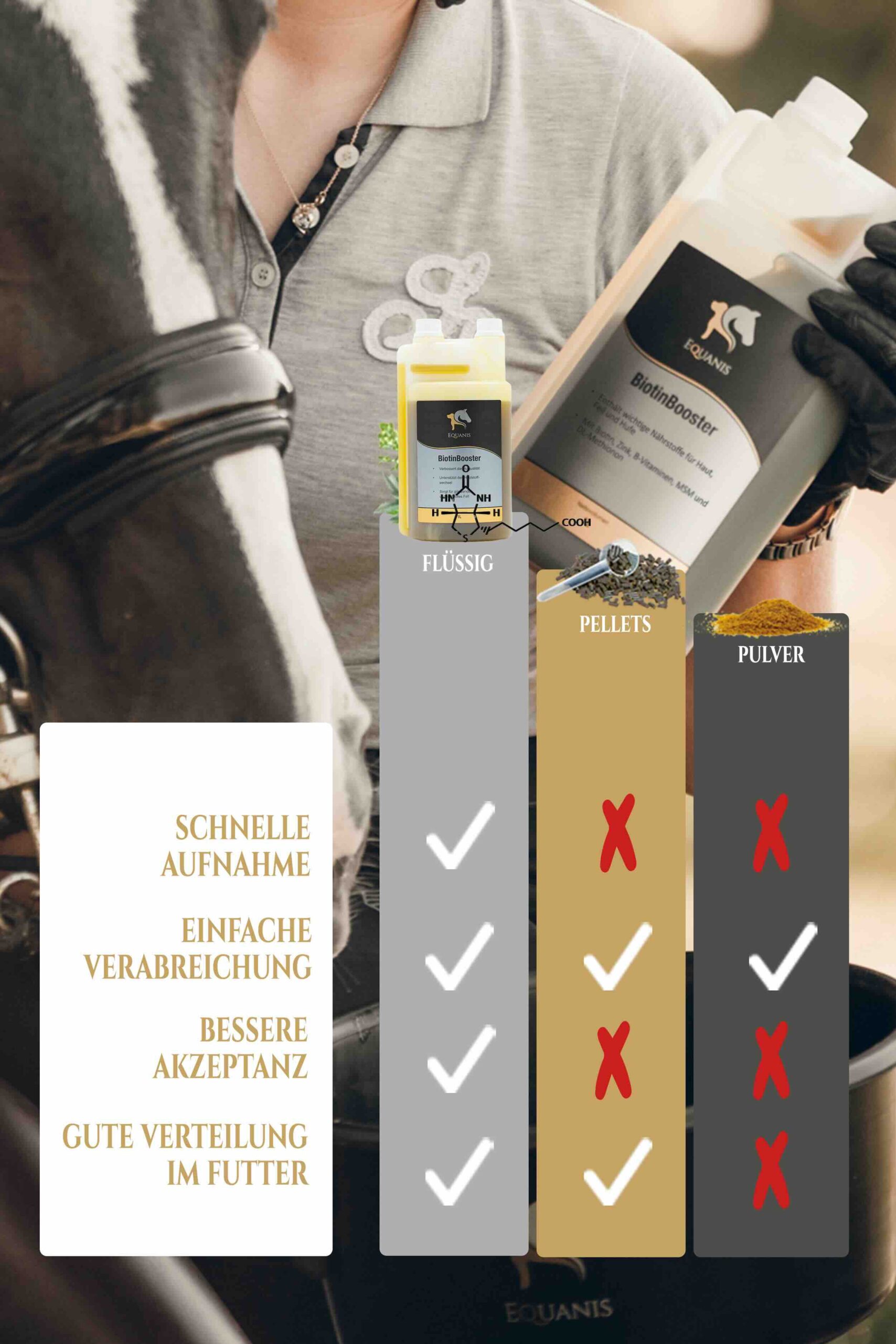 Durch die flüssige Formulierung ist der BiotinBooster einfach zu verabreichen und ergänzt die tägliche Ration Ihres Pferdes optimal.
