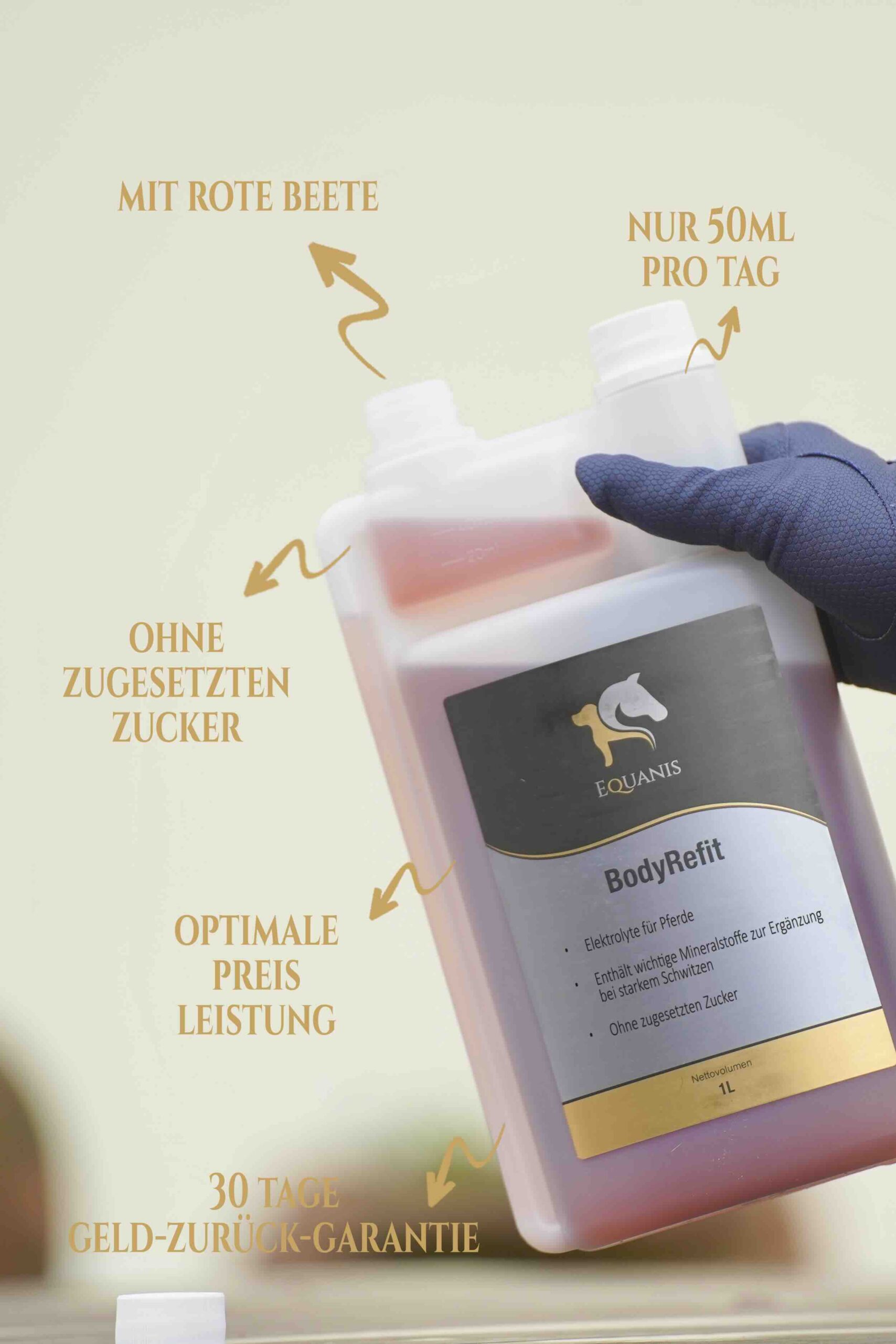 Nach starkem Schwitzen oder anderen Belastungen leidet auch ein Pferd unter erheblichem Elektrolytverlust. Um diesen auszugleichen, ist unser BodyRefit ideal. Elektrolyte regulieren den Wasserhaushalt, damit der Stoffwechsel des Pferdes optimal arbeiten kann. Unser flüssiges, hochwertiges Ergänzungsfutter für Pferde wird von Organismus sehr schnell aufgenommen. Es unterstützt den Elektrolythaushalt des Pferdes und hilft, bei hoher Beanspruchung einem Ungleichgewicht vorzubeugen.