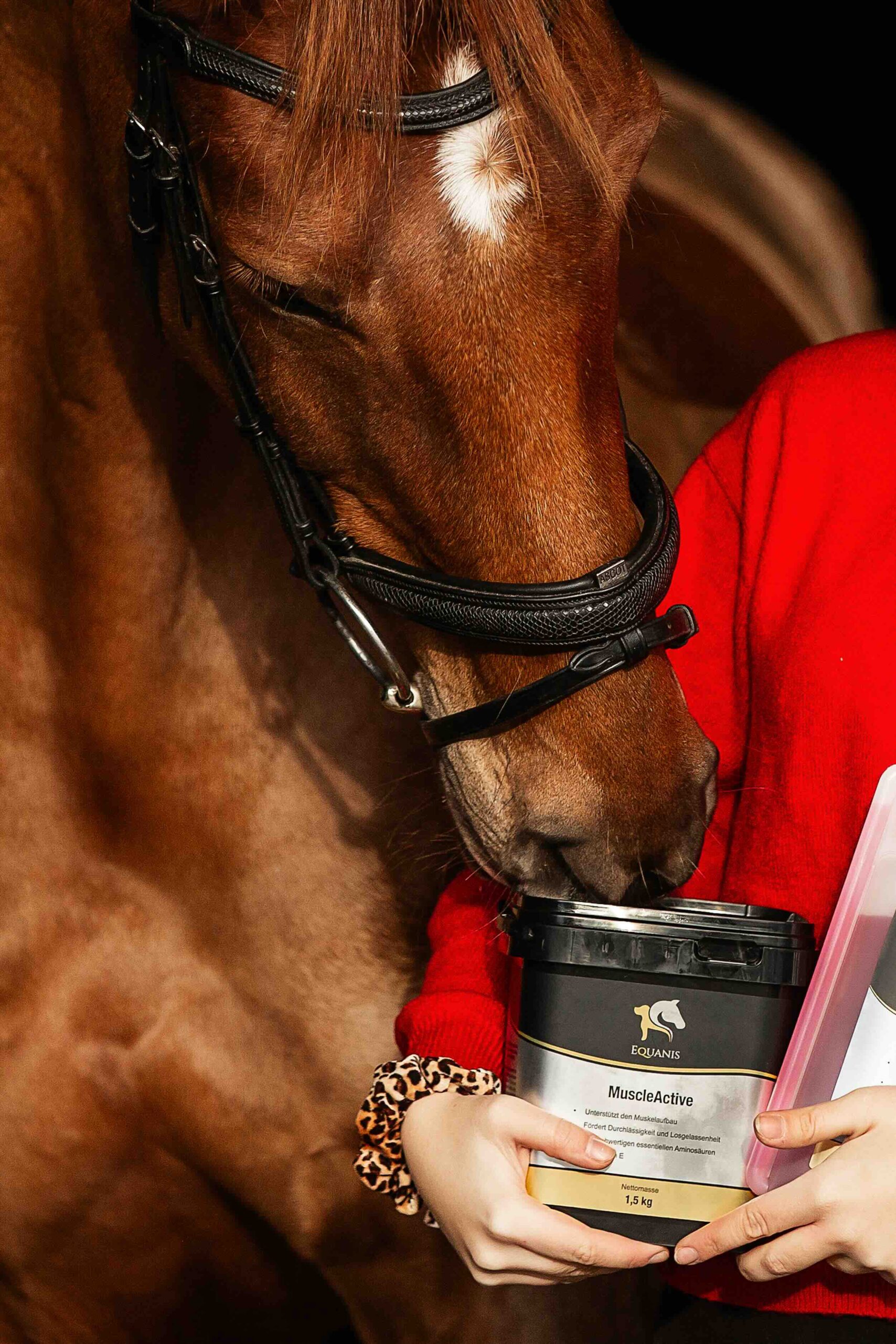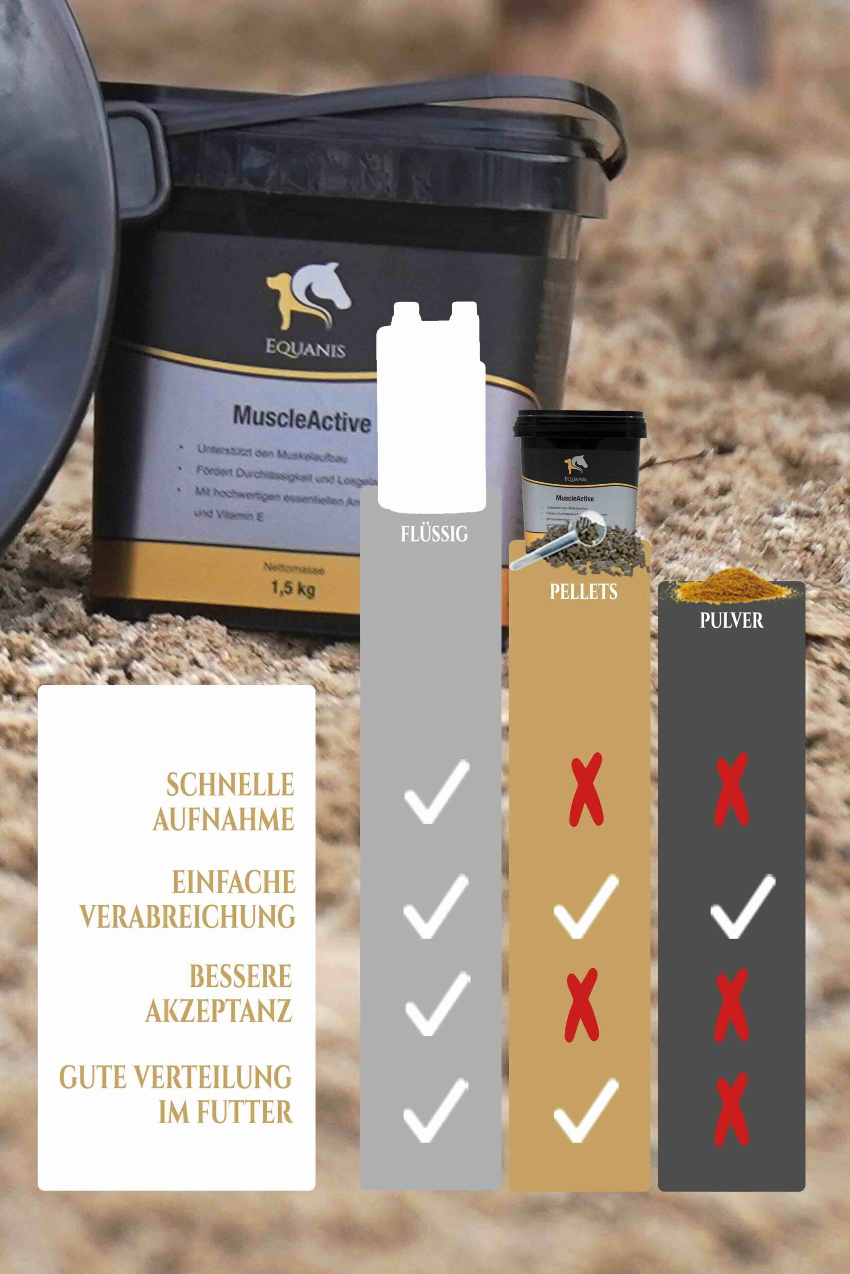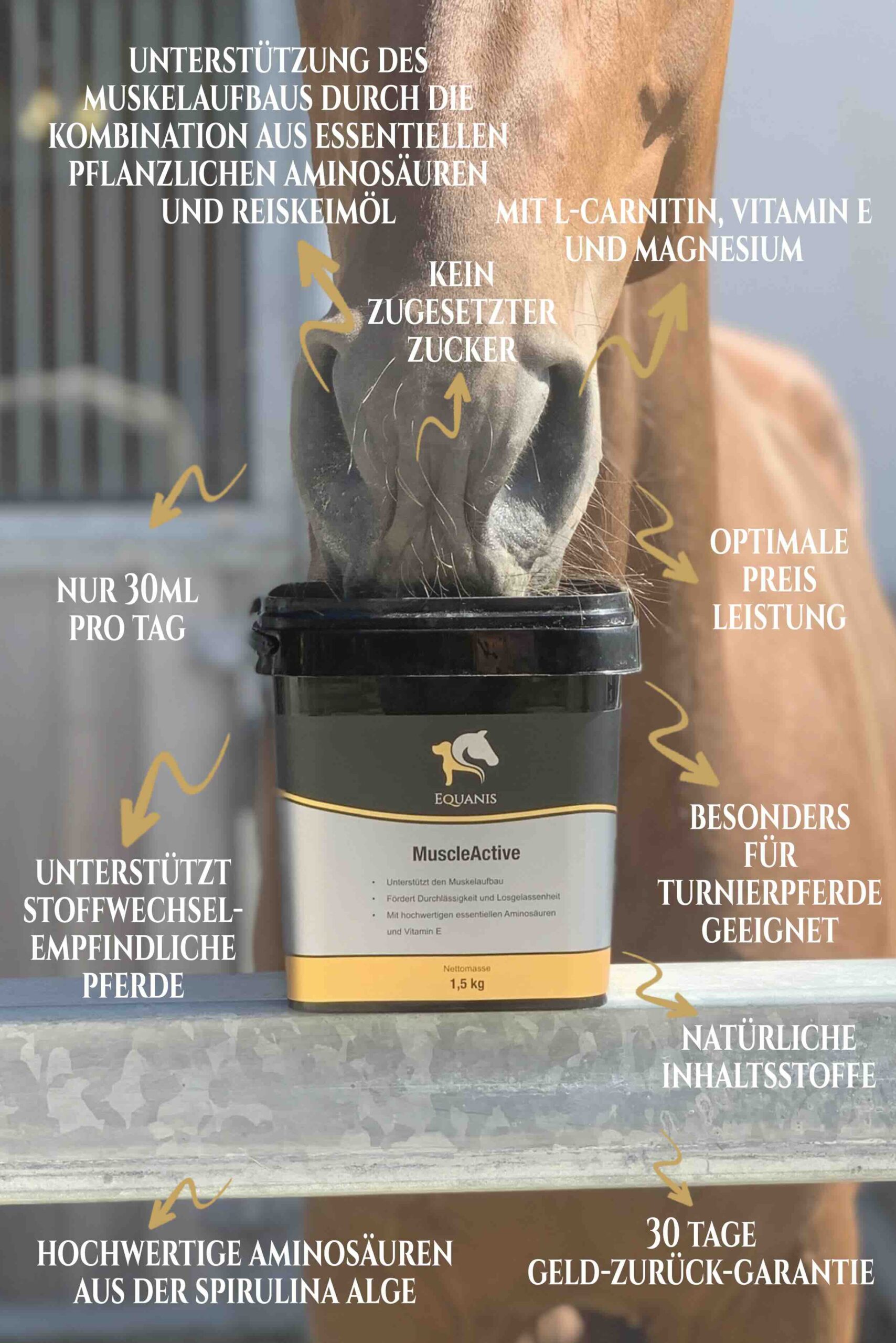 MuscleActive enthält wertvolle Nährstoffe wie Aminosäuren aus Spirulina und Erbse, L-Carnitin sowie wichtige Mineralstoffe und Vitamine wie Calcium, Magnesium und Vitamin E. Diese unterstützen den normalen Muskelstoffwechsel und tragen zur Erhaltung der Muskulatur bei, insbesondere während intensiven Trainingsphasen. Nährstoffe wie Omega-3-Fettsäuren und Antioxidantien bieten zusätzlichen Zellschutz und unterstützen das Wohlbefinden Ihres Pferdes.