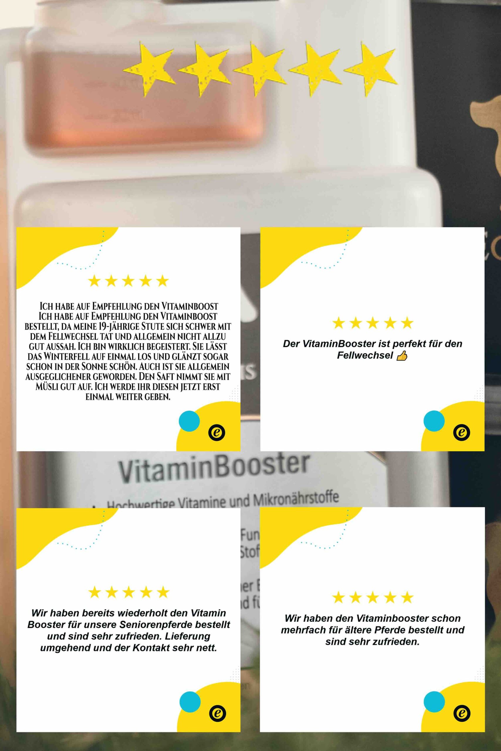 Schon nach ca. einer Woche habe ich festgestellt, dass das Fell viel besser aussah und sie deutlich weniger hustet. Ihre kahlen Hautstellen sind viel besser und vor allem schneller abgeheilt. Sie ist außerdem deutlich besser drauf und viel gehfreudiger als sonst im Winter. Wir sind von dem VitaminBooster absolut begeistert und können ihn mit besten Gewissen weiterempfehlen. Wir werden den Saft jetzt definitiv im Fellwechsel und zum Herbst/Winter immer wieder als Kur füttern.
